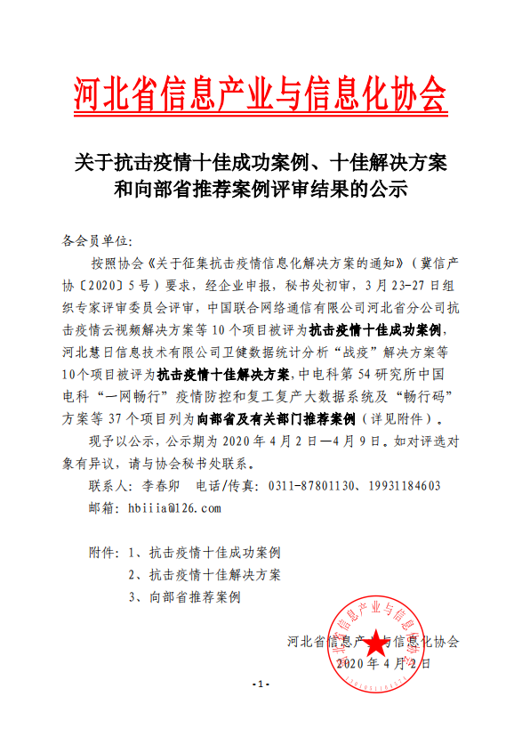 4月9日,河北省信息產(chǎn)業(yè)與信息化協(xié)會,正式發(fā)布了《關(guān)于抗擊疫情十佳成功案例、十佳解決方案和向部省推薦案例評審結(jié)果的公示》,我司衛(wèi)健數(shù)據(jù)統(tǒng)計分析“戰(zhàn)疫”解決方案項目被評為抗擊疫情十佳解決方案,并列為向部省及有關(guān)部門推薦案例!