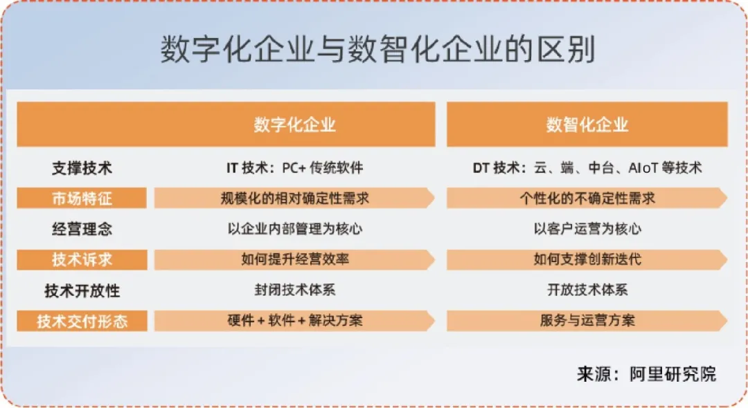 “數(shù)字化企業(yè)”正加速向“數(shù)智化企業(yè)”演進(jìn),其本質(zhì)區(qū)別不僅僅表現(xiàn)在支撐技術(shù)體系的差異性,而且體現(xiàn)在數(shù)智化企業(yè)面臨的市場(chǎng)特征、經(jīng)營(yíng)理念、技術(shù)訴求、技術(shù)開放性、技術(shù)交付形態(tài)的差異性。