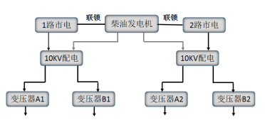 在上述供配電系統(tǒng)架構(gòu)中,為避免日常狀態(tài)下備用電源啟用對(duì)電網(wǎng)的影響,通常對(duì)市電電源與備用柴油發(fā)電電源進(jìn)行邏輯與機(jī)械互鎖的設(shè)計(jì),形成“2N+1”的兩路市電主用電源與柴油發(fā)電機(jī)系統(tǒng)備用電源供電架構(gòu),此架構(gòu)的穩(wěn)定性、可用性較高,在當(dāng)前數(shù)據(jù)中心建設(shè)中廣泛使用。