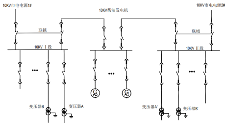 某數(shù)據(jù)中心高壓供電架構(gòu)如圖2所示,該數(shù)據(jù)中心機(jī)房側(cè)10KV高壓系統(tǒng)為單母線分段,之間不設(shè)母聯(lián)斷路器,低壓系統(tǒng)配置母聯(lián)斷路器,柴油發(fā)電系統(tǒng)由10臺(tái)高壓機(jī)組組成,與兩路市電形成“或”的關(guān)系,即在兩路市電都停電的情況下,柴油發(fā)電機(jī)系統(tǒng)啟動(dòng)并給負(fù)載供電。柴油發(fā)電系統(tǒng)與兩路10KV線路之間設(shè)置電氣和機(jī)械互鎖,防止柴油發(fā)電系統(tǒng)與市電系統(tǒng)同時(shí)供電造成的不良后果。