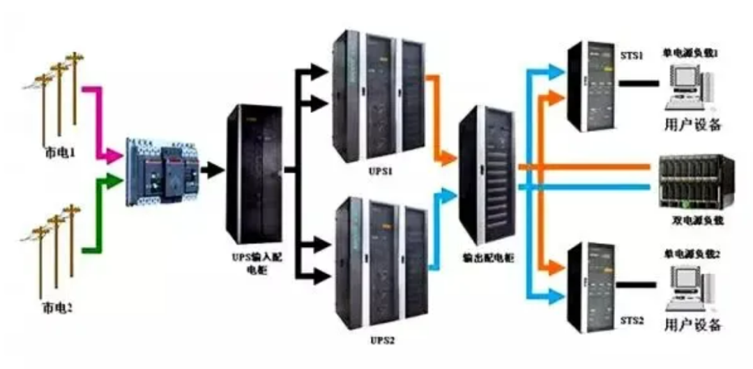 《數(shù)據(jù)中心設(shè)計(jì)規(guī)范》(GB50174—2017)規(guī)定,2N系統(tǒng)的兩路市電與柴油發(fā)電機(jī)為主備關(guān)系,一般市電與柴油發(fā)電機(jī)的邏輯關(guān)系為當(dāng)兩路市電都停電時(shí),柴油發(fā)電機(jī)啟動(dòng)對(duì)后端負(fù)載進(jìn)行供電保障。因控制邏輯判斷、信號(hào)接收、斷路器分合閘動(dòng)作等時(shí)延因素,在市電切換柴油發(fā)電機(jī)的過程中,存在幾十秒甚至數(shù)分鐘的時(shí)間差。在某數(shù)據(jù)中心實(shí)測(cè),10KV高壓ATS切換系統(tǒng)市電停電切換至柴油發(fā)電機(jī)供電用時(shí)約19秒;市電來電恢復(fù),柴油發(fā)電機(jī)切換至市電用時(shí)約16秒。在市電與柴油發(fā)電機(jī)相互切換的停電過程中,負(fù)載業(yè)務(wù)的供電由交流或直流不間斷電源的后備蓄電池進(jìn)行保障?!稊?shù)據(jù)中心設(shè)計(jì)規(guī)范》(GB50174—2017)規(guī)定,當(dāng)以柴油發(fā)電機(jī)為后備電源時(shí),A級(jí)數(shù)據(jù)中心蓄電池最少備用時(shí)間為15分鐘。理論上不間斷電源蓄電池的后備保障時(shí)長,足以保障市電與柴油發(fā)電機(jī)的切換時(shí)間。
