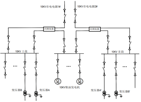 在正常情況下,由兩路高壓市電分別供電;當(dāng)兩路市電同時(shí)停電時(shí),柴油發(fā)電機(jī)啟動(dòng)給后端負(fù)載供電。上述兩種情況同期裝置為無壓供電模式,即單路電源供電。當(dāng)需進(jìn)行油機(jī)帶載測(cè)試或應(yīng)急演練時(shí),手動(dòng)啟動(dòng)柴油發(fā)電機(jī)組通過1段或2段同期裝置進(jìn)行同期手動(dòng)并網(wǎng)。在該設(shè)計(jì)方案中,柴油發(fā)電系統(tǒng)只針對(duì)其中某一路市電進(jìn)行并網(wǎng),不設(shè)置同時(shí)跟蹤兩路市電進(jìn)行并網(wǎng)操作。