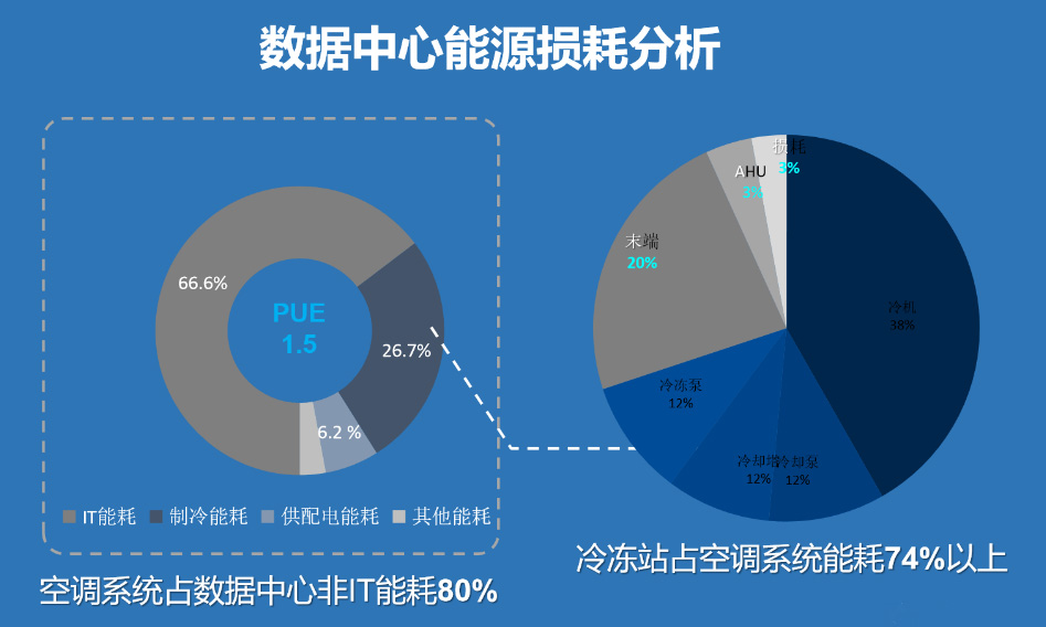 PUE是數(shù)據(jù)中心總能耗與IT設(shè)備能耗的比值,數(shù)值越接近1代表其用能效率越高。從數(shù)據(jù)中心行業(yè)能耗構(gòu)成來看,主要包括IT設(shè)備能耗、制冷系統(tǒng)能耗、供配電系統(tǒng)能耗、照明及其他能耗,其中IT設(shè)備能耗占比最大,其次是制冷系統(tǒng)能耗。因此高效IT設(shè)備、高效制冷系統(tǒng)等先進(jìn)基礎(chǔ)設(shè)施,正是數(shù)據(jù)中心減小散熱消耗、提升用能效率的關(guān)鍵之一。