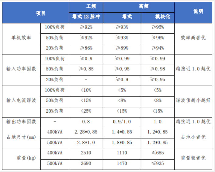 UPS可以分為工頻塔式、高頻塔式、高頻模塊化等形式。從技術(shù)發(fā)展路徑來看,高頻技術(shù)在效率、成本、諧波、占地等各方面均優(yōu)于工頻,高頻技術(shù)全面取代工頻技術(shù)成為趨勢。