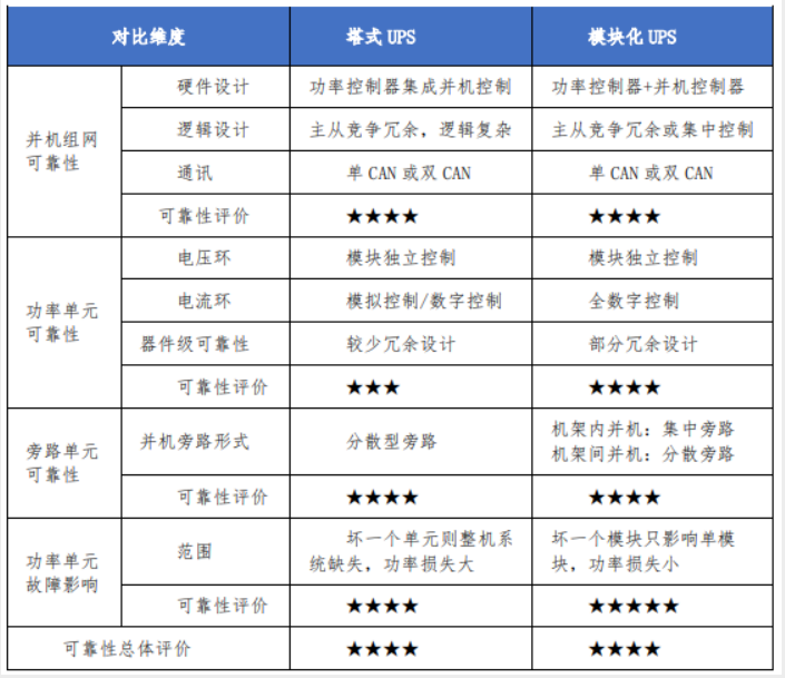 在高頻技術(shù)之下,模塊化和傳統(tǒng)塔式兩種形式不相上下。模塊化UPS在運維、安裝維護、后期擴容方面具有優(yōu)勢,被許多數(shù)據(jù)中心服務商和行業(yè)用戶廣泛應用。業(yè)內(nèi)也有不同的聲音,認為多個模塊并機存在風險,可靠性值得考慮。從傳統(tǒng)塔式與模塊化的可靠性對比來看,兩者旗鼓相當,模塊化甚至更優(yōu)。從近年新上市的UPS來看,大部分都采用了模塊化架構(gòu),可見,模塊化UPS是交流UPS的發(fā)展方向。