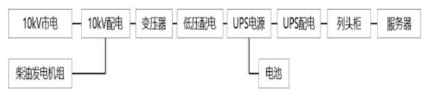 按照功能組成,供配電系統(tǒng)主要由10kV配電、柴油發(fā)電機組、變壓器、低壓配電、UPS電源及其配電、電池、列頭柜等部分組成,其基本原理如下圖所示。