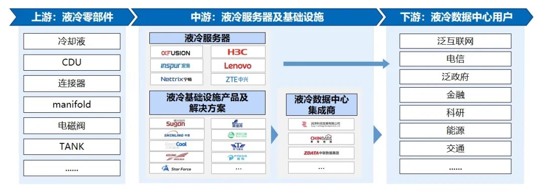 當(dāng)前,產(chǎn)業(yè)鏈上下游企業(yè)積極拓展業(yè)務(wù)布局,液冷服務(wù)器廠(chǎng)商,液冷數(shù)據(jù)中心集成商,頭部互聯(lián)網(wǎng)企業(yè),基礎(chǔ)電信運(yùn)營(yíng)商將成為液冷產(chǎn)業(yè)發(fā)展的重要推動(dòng)力量:
