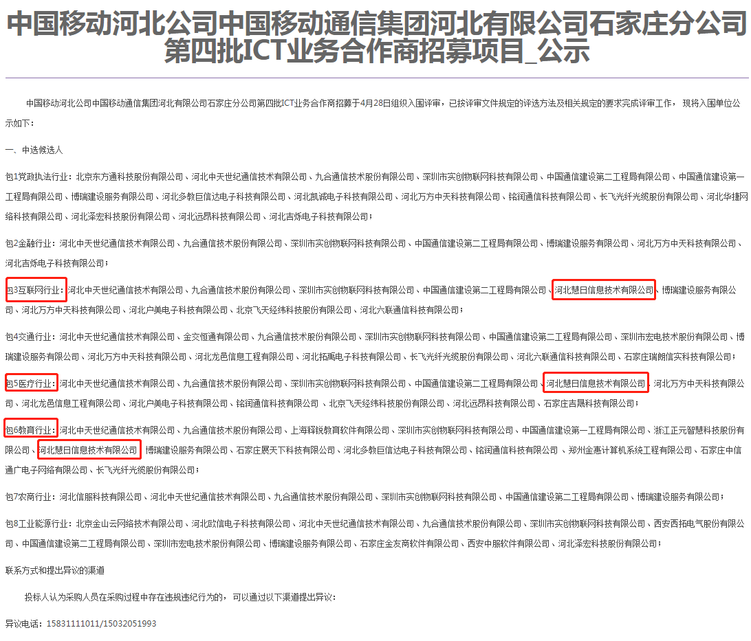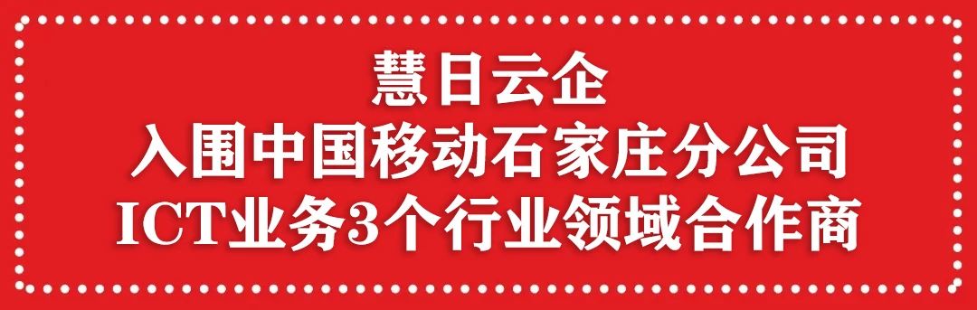 2020年04月,慧日云企從百家企業(yè)中脫穎而出 ,成功入選中國移動通信集團(tuán)石家莊分公司2020年第四批ICT業(yè)務(wù)合作商招募項(xiàng)目。本次ICT項(xiàng)目共劃分為8類標(biāo)包,我司成功入選互聯(lián)網(wǎng)、醫(yī)療、教育3個(gè)行業(yè)領(lǐng)域合作伙伴。