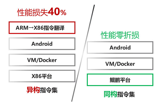 目前,全球一共有500多萬移動(dòng)APP,這些應(yīng)用都是基于ARM指令集進(jìn)行開發(fā)的,海量移動(dòng)應(yīng)用在向云上遷移的過程中,以前通常采用在通用CPU服務(wù)器上增加實(shí)時(shí)指令翻譯來實(shí)現(xiàn)。但是這會(huì)帶來兩個(gè)問題:一是會(huì)有40%的性能損失,二是還有大約20%的代碼庫無法實(shí)時(shí)翻譯。