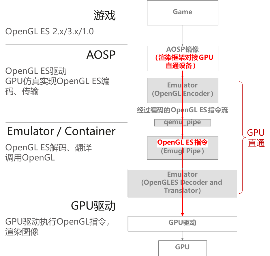 Android應(yīng)用,特別是游戲,都是使用OpenGL ES來做渲染加速。開源非直通方案,實(shí)現(xiàn)方式如圖1。軟件傳輸和翻譯等處理會(huì)帶來CPU、內(nèi)存等資源額外的開銷,導(dǎo)致性能、兼容性等問題。