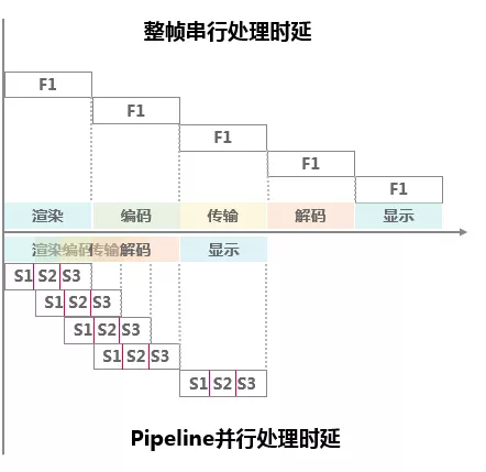 通過pipeline技術(shù),把單幀又做了拆分,拆成了一條一條,渲染出一條的時(shí)候,編碼就把這一條拿過來開始編碼,編完了就交給傳輸。這樣,一幀畫面渲染完,編碼、傳輸和解碼也都同步完成??蛻舳税堰@一條一條重新拼在一起,渲染到屏幕上即可。