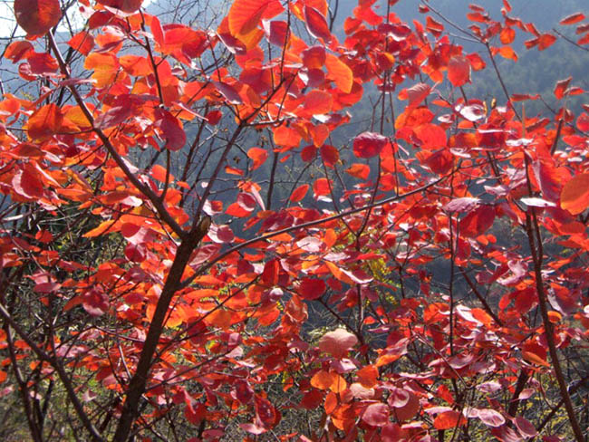 漫步林間,仿佛徜徉于一個(gè)紅色世界,抬頭仰望,蔚藍(lán)的天空已被紅葉遮蓋,陽光透過紅葉漏在身上,星星點(diǎn)點(diǎn),像舞廳里五彩繽紛的燈光。石縫間、懸崖上,圓形、五角形、橢圓形,樺葉、楓葉、核桃楸葉,知名的,不知名的,林林總總。