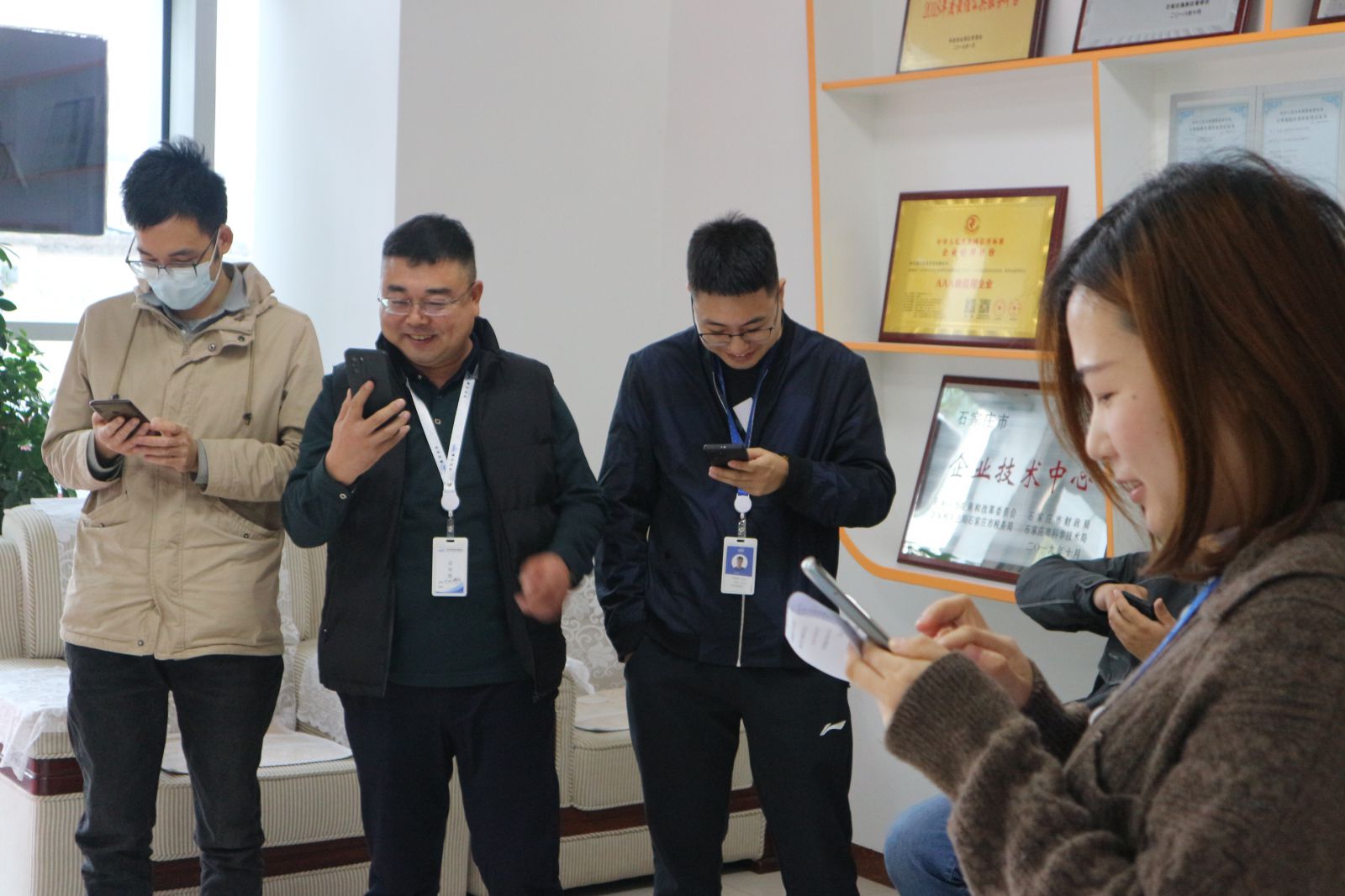 “點金圣手”第一名王康(左一)“集單大圣”第一名李交娜(左二),慧日副總經(jīng)理張毅(右)