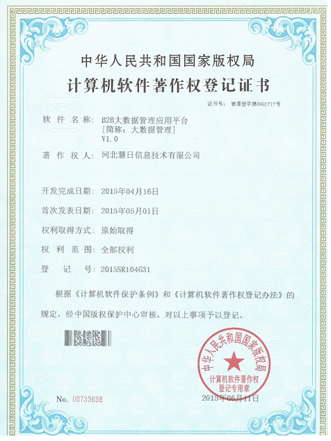 河北慧日信息技術有限公司技術團隊經(jīng)過一年多艱苦研發(fā)測試在"B2B大數(shù)據(jù)管理應用平臺"項目終于獲得河北省科學院技術情報研究院(國家科委認定的一級科技查新咨詢單位)的查新鑒定。同時該系統(tǒng)平臺軟件獲得中華人民共和國國家版權(quán)局頒發(fā)的“計算機軟件著作權(quán)登記證書”
