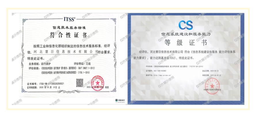 兩項認證的獲得,標志著慧日云企在信息系統(tǒng)建設全流程管理能力和IT服務標準化水平上達到國家權威標準,雙重背書,為客戶提供“合規(guī)+可靠”的雙重保障!