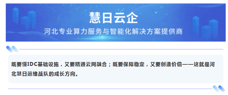 在河北慧日,運維不再是一份“看不見的工作”,而是一條通往技術(shù)專家、解決方案架構(gòu)師甚至業(yè)務(wù)開拓者的成長之路。我們期待每一位運維隊員在這里:懂技術(shù)、能打仗、會盈利——成為數(shù)字時代真正的運維鐵軍。